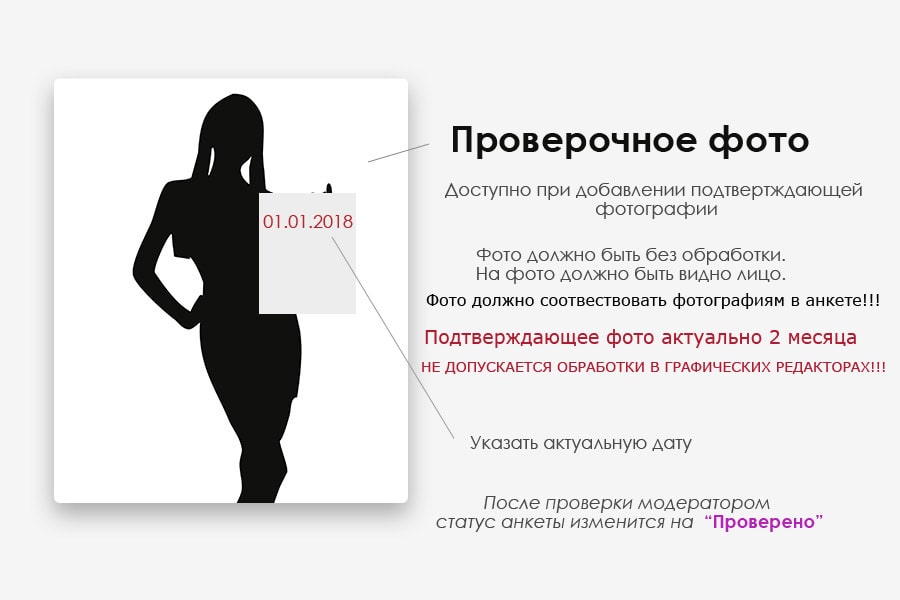 Если по проверочной фото не возможно будет идентифицировать фотографии в анкете, то проверка анкеты НЕ БУДЕТ положительной и анкета не будет допущена к бесплатному размещению!